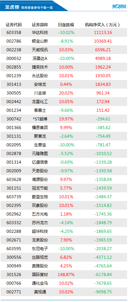 12月26日龙虎榜中,共31只个股出现了机构的身影,有10只股票呈现机构净买入,21只股票呈现机构净卖出。当天机构净买入前三的股票分别是华达科技、银宝山新、天威视讯;当天机构净卖出前三的股票分别是真视通、通化金马、国际复材。