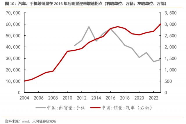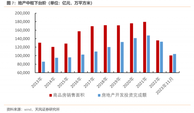 随着房地产迎来长周期拐点,房地产投资、销售规模从2021年的14.8万亿元和17.9亿平方米下滑至2023年11月的10.4万亿元和10亿平方米。以地产为核心的经济-信用发展模式对经济的支撑快速减弱。传统的投资驱动模式逐渐失效,经济进入“L”形减速换挡期,政策强调通过发挥国内超大规模市场和制造业优势来推动中国经济高质量发展。