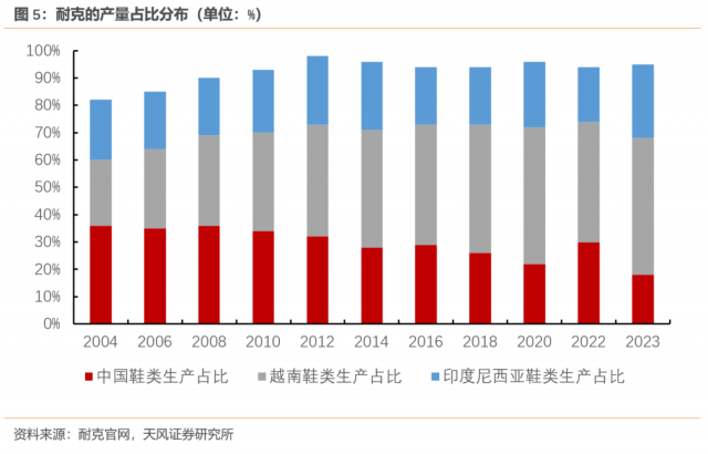 外迁企业的代表有耐克。耐克作为跨国企业,一直在全球布局生产工厂。2004年,中国、越南、印度尼西亚分别提供了36%、24%、22%的耐克品牌鞋,中国一度是耐克最大的海外生产地。但2008年后,中国生产占比持续震荡回落,到2023年占比仅剩18%,越南生产鞋类占比已经升至50%,成为耐克最大的海外生产地。