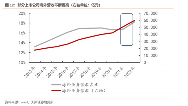 2022年,A股1300多家(有连续海外营收)上市公司的海外营收规模为6万亿,是2013年1.7万亿的3.5倍,海外营收占上市公司总营收的比重从2013年的13.2%上升至2022年的18.2%。