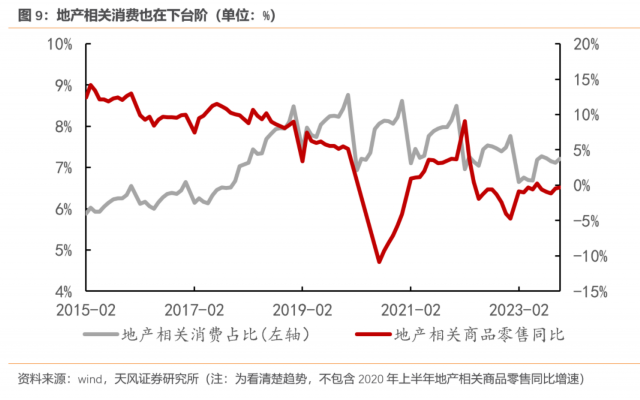地产下行后,土地财政模式难以为继,地方政府土地出让收入从2021年的8.7万亿下滑至2023年11月的4.2万亿,明显制约了地方政府发力基建的能力。同时,地产销售下滑也带动居民地产相关消费支出回落,2023年地产类商品零售额占零售额比重相比于2020年下滑1.1个百分点。