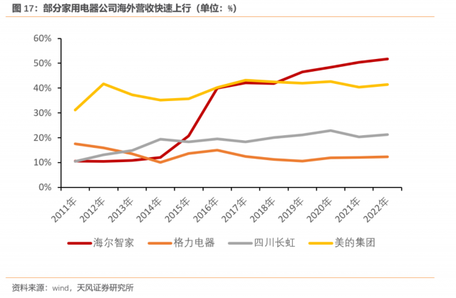 家电的出海早于汽车。美的集团、海尔智家等家电企业的海外营收占比从2013年的37.3%和10.9%稳步提升至2022年的41.5%和51.8%。依靠海外营收,海尔智家的营收规模已经超过海外营收占比12.3%的格力电器,成为家电行业营收第二的公司。