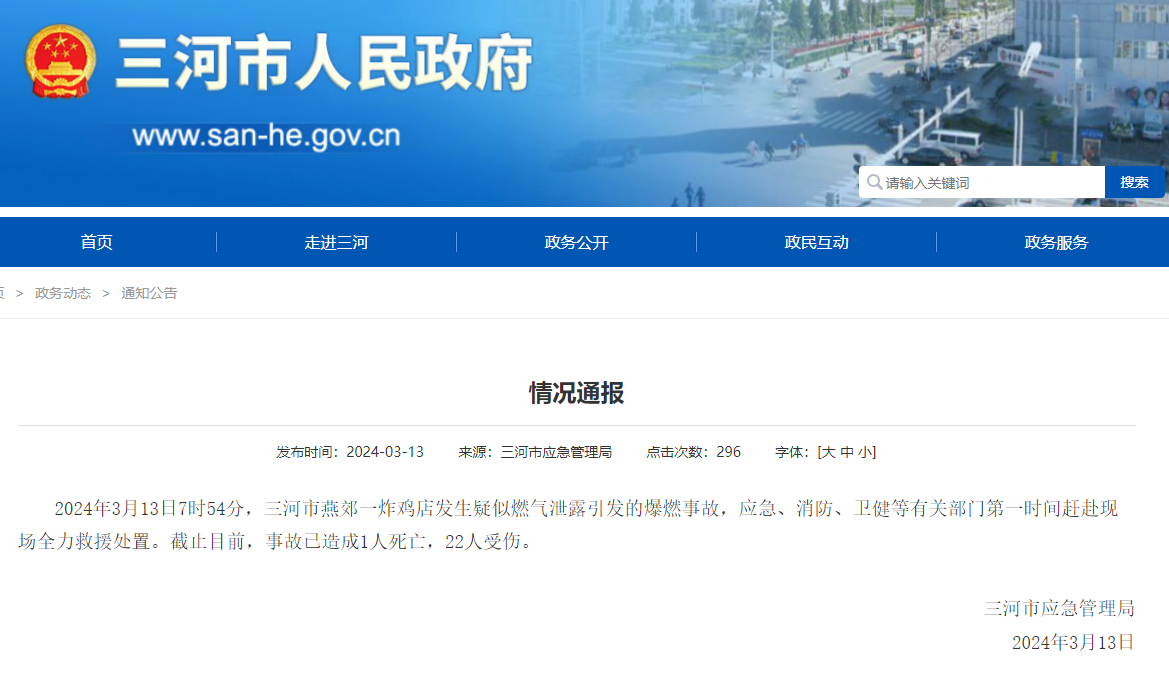 3月13日,三河市应急管理局发布情况通报。3月13日7时54分,三河市燕郊一炸鸡店发生疑似燃气泄露引发的爆燃事故,应急、消防、卫健等有关部门第一时间赶赴现场全力救援处置。截至目前,事故已造成1人死亡,22人受伤。