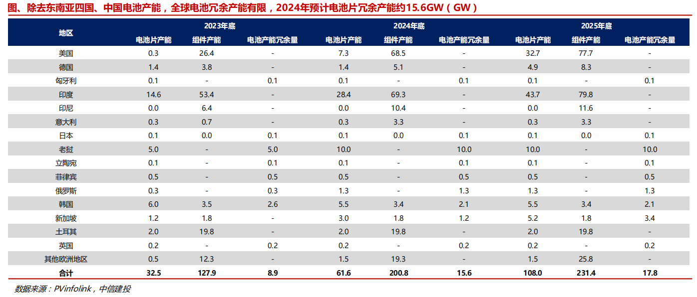 但除去东南亚四国及中国的电池产能,全球电池冗余产能有限,2024/2025年预计电池片冗余产能约15.6、17.8GW。倘若东南亚双反关税落地,东南亚出口至美国的电池组件规模预计会明显减少,后续美国终端开发商可能会通过在东南亚以外其他国家进口。但目前东南亚四国以外的电池产能明显小于组件产能,预计海外电池产能可能会成为后续出口美国市场的一大瓶颈。