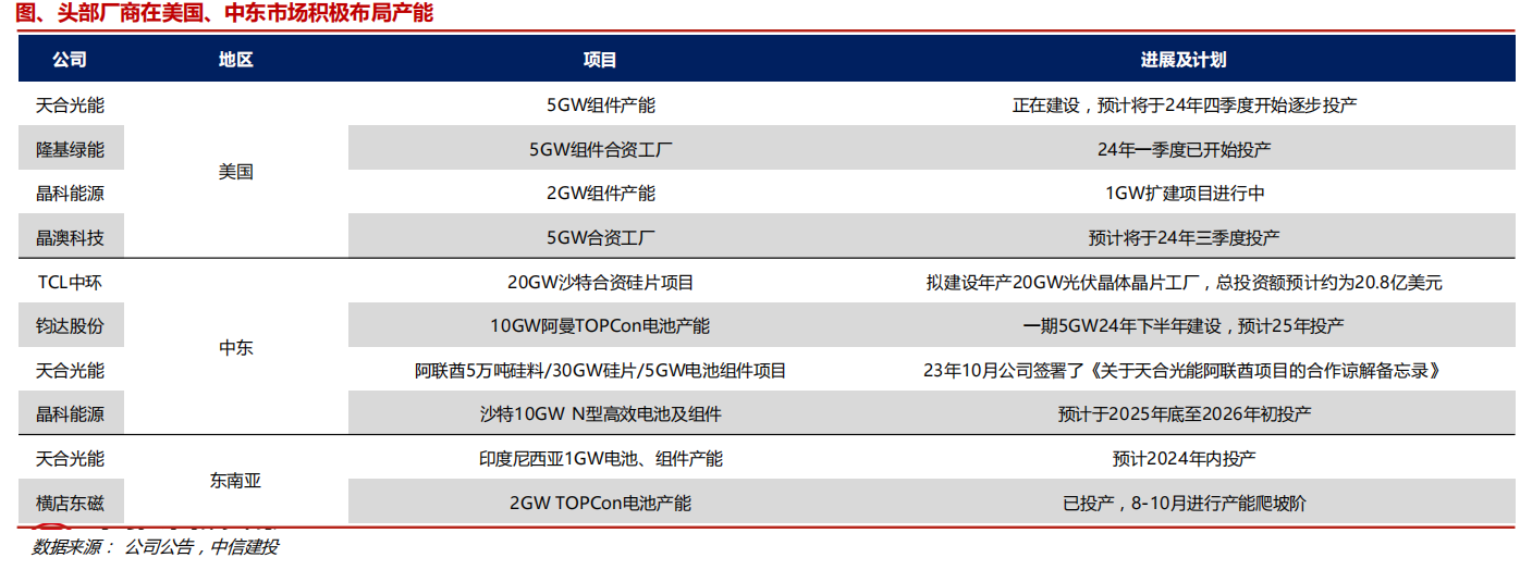 目前头部厂商积极推动美国本土产能建设,其中天合光能美国5GW组件、印尼1GW电池组件产能正在建设;隆基绿能美国5GW合资工厂在今年一季度已投产;晶科能源2024年底前预计投产2GW美国组件产能;晶澳科技美国2GW组件产能预计将于今年投产;阿特斯5GW组件产能已于2023年底投产,目前正在爬坡,5GW TOPCon电池预计将在2025年投产。此外,晶科能源、天合天能、钧达股份、TCL中环等头部厂商积极布局中东产能,横店东磁2GW东南亚电池产能已投产,预计8-10月进入产能爬坡期。