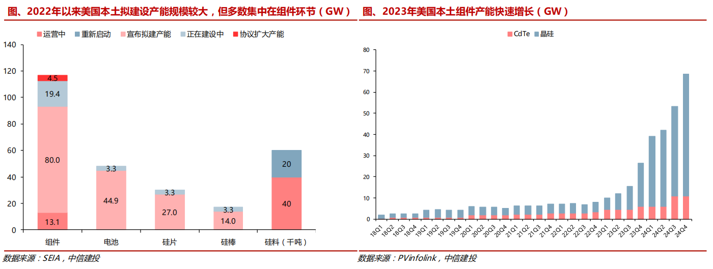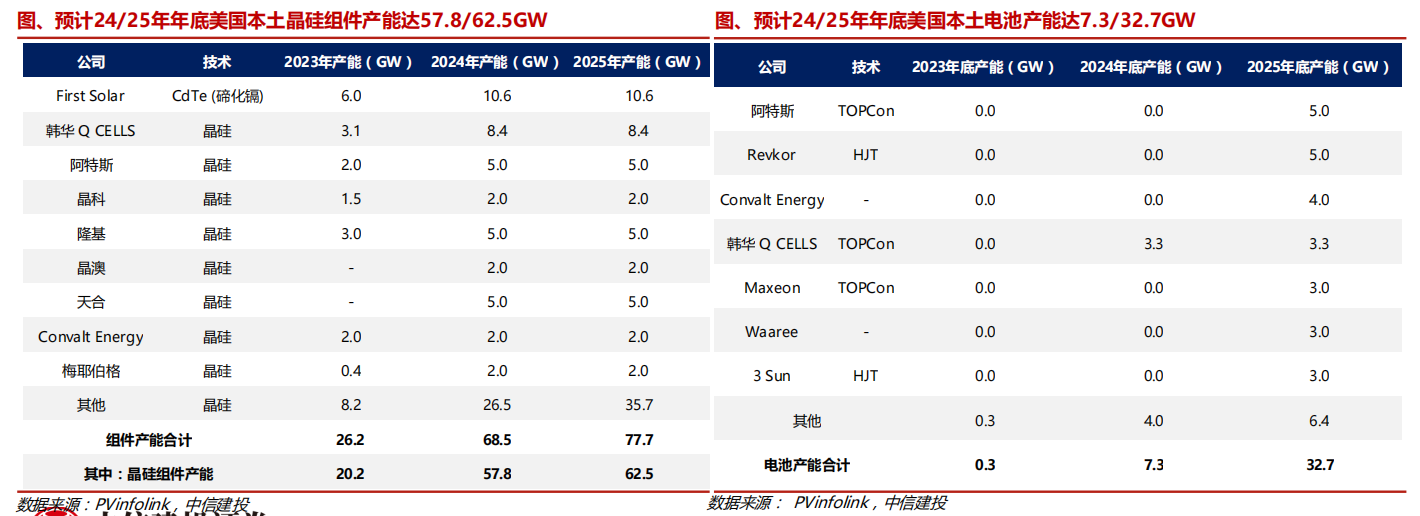 根据PVinfolink数据,截至2023年底美国本土光伏电池产能仅为0.3GW,预计2024/2025年美国本土电池产能约7.3/32.7GW,较57.8/68.5GW的晶硅组件产能存在较大供给缺口,需要依靠进口电池片弥补产能缺口。