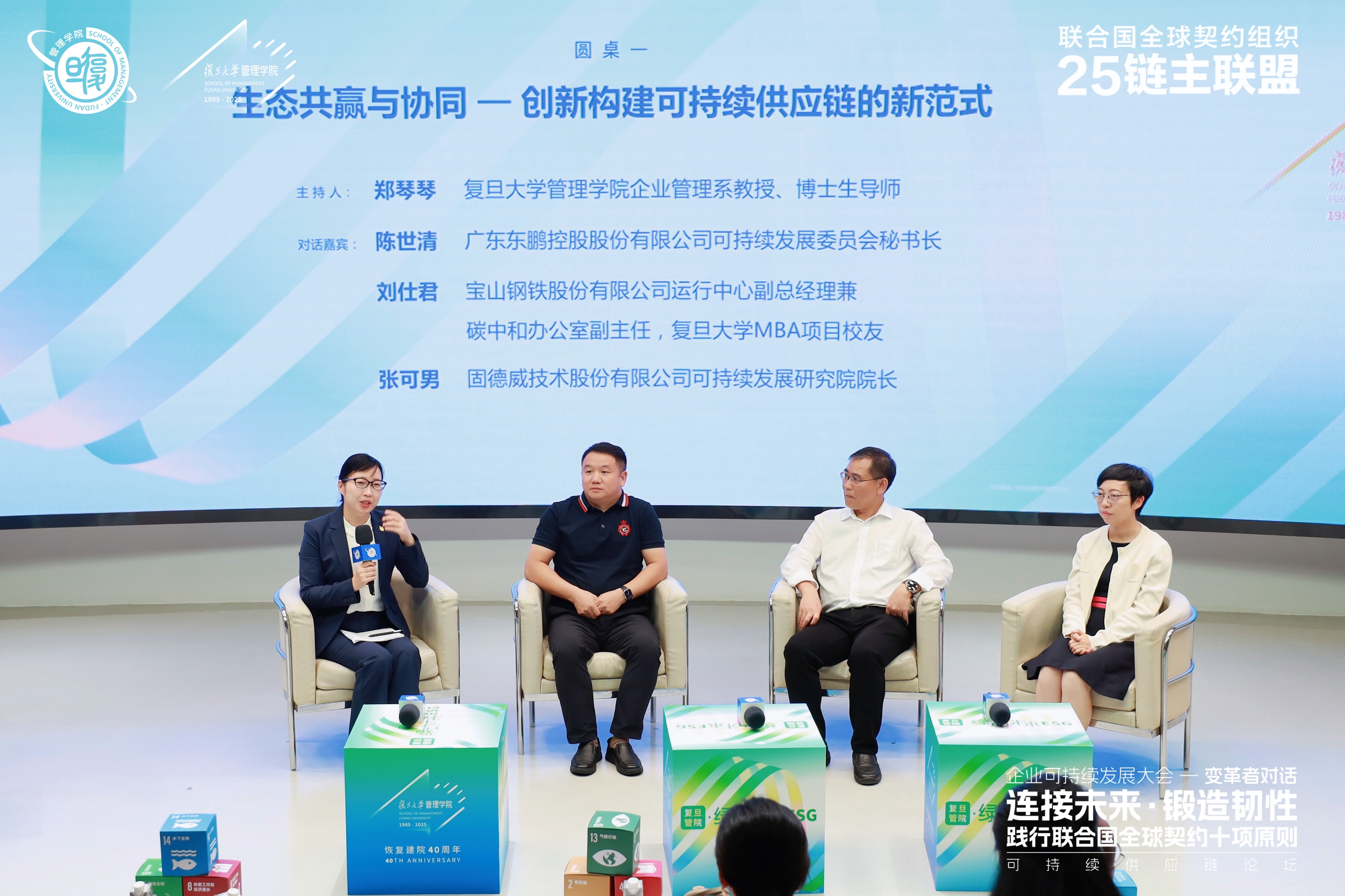 在“生态共享与协同”圆桌讨论中,复旦大学管理学院企业管理系教授、博士生导师郑琴琴作为主持人,开篇即点明核心议题:在供应链复杂度攀升、可持续需求迫切的背景下,链主企业如何通过创新模式实现生态协同,为行业提供可复制的“新范式”?来自东鹏控股、宝钢股份与固德威的三家企业代表,围绕可持续供应链的协同创新与系统治理展开深度交流。各方一致认为,链主企业需从“单向管控”转向“生态赋能”,通过技术协同、数据共享与平台共建,提升整链韧性。东鹏控股通过“4+1”供应链管理模式与在地固废再生技术,将ESG要素融入供应商评估与产品设计;宝钢股份则打造“欧贝零碳平台”,为上千家供应链伙伴提供碳核算与减碳路径服务,推动全链碳排放可视化与协同减排;固德威则从“甲醛超标”事件出发,联合上下游建立有害物质溯源与共管机制,展示出数字化与透明化在供应链治理中的关键作用。圆桌共识指出,链主企业应主动承担“赋能者”角色,助力中小企业跨越认知、能力与数字鸿沟,共同构建包容、绿色、可持续的供应链生态。