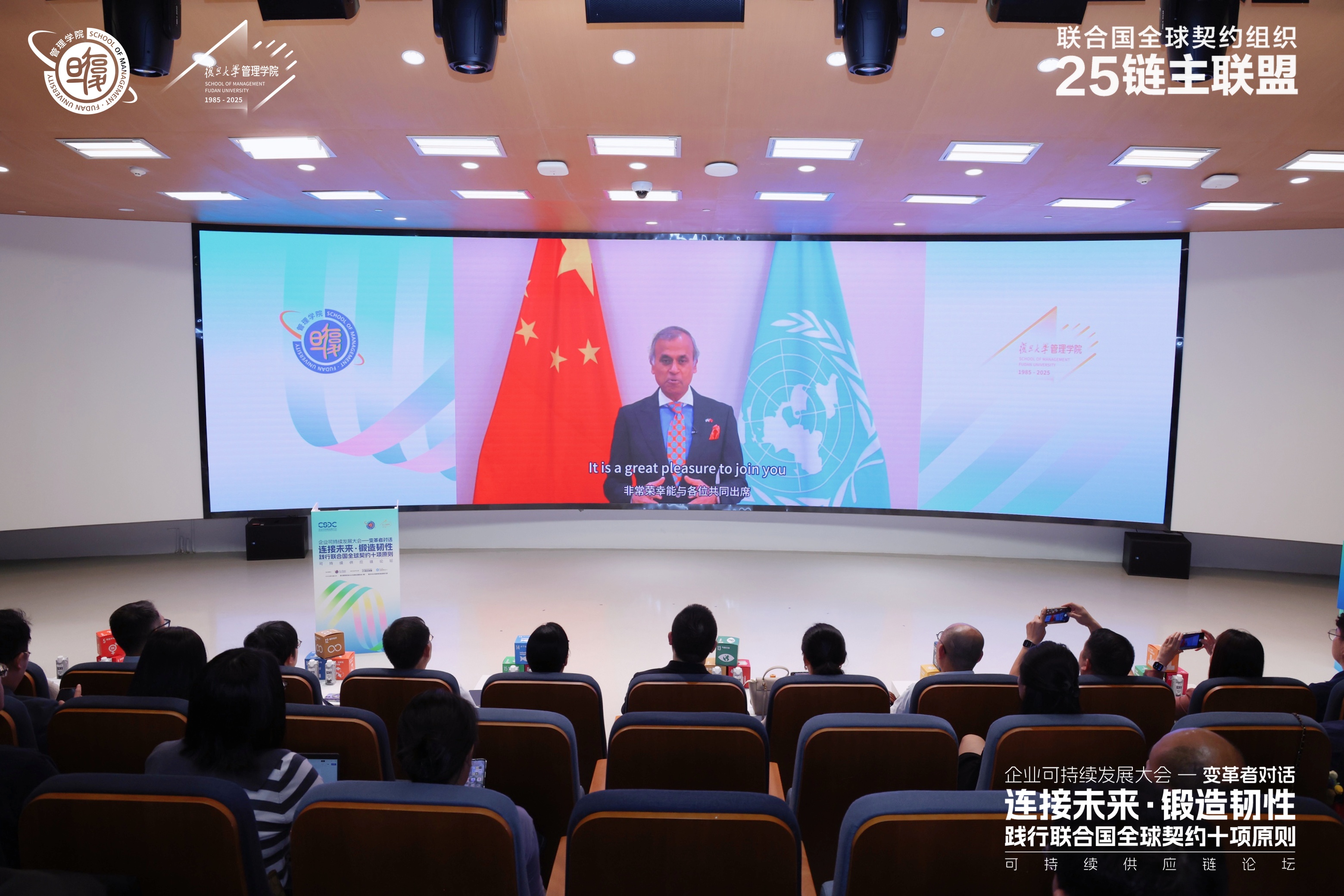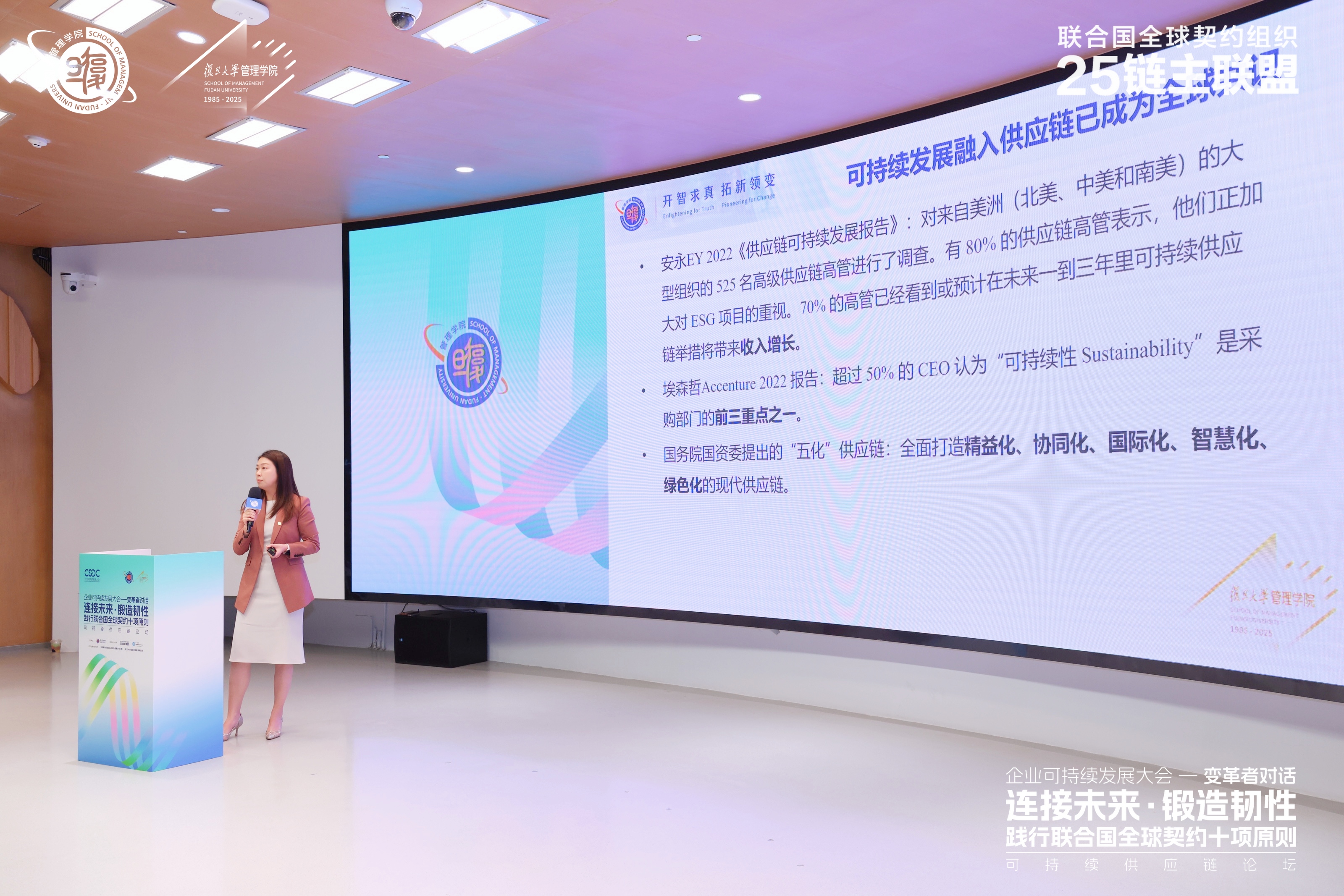 2025年,复旦大学管理学院迎来恢复建院40周年的重要里程碑。自1985年乘改革开放东风重启征程以来,复旦管院始终立足中国商业实践、对话全球商业文明,以“开智求真 拓新领变”为理念,在人才培养、学术研究与社会服务领域书写了辉煌篇章。作为院庆系列活动中聚焦时代命题的重要组成部分,近日,由复旦大学管理学院主办,联合国全球契约组织25链主联盟、第一财经可持续发展研究中心提供知识支持的“变革者对话:连接未来・锻造韧性—践行联合国全球契约十项原则可持续供应链论坛”圆满落幕。来自学界、商界、国际组织的各界代表齐聚一堂,共探供应链可持续发展的路径与未来,为复旦管理学院恢复建院40周年献上了一场聚焦时代命题的思想盛宴。本次论坛聚焦“践行联合国全球契约十项原则”,吸引了来自学界、企业界及国际组织的众多嘉宾,共同探讨供应链可持续发展的路径与实践。