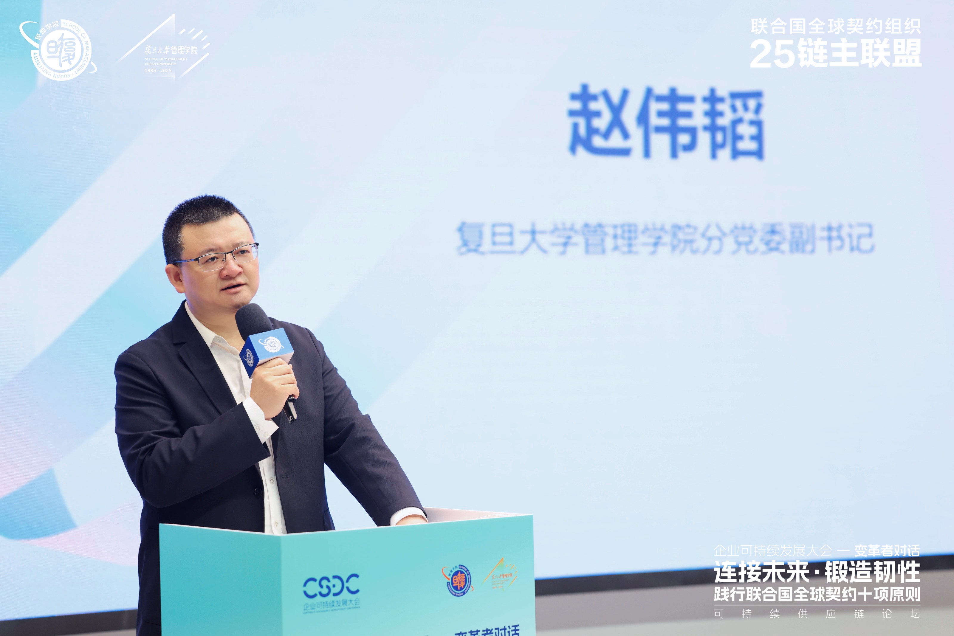 论坛在复旦大学管理学院分党委副书记赵伟韬的欢迎辞中拉开帷幕。他指出,可持续发展是企业高质量发展的必由之路,而这一理念正是复旦管院四十年办学过程中“社会责任感”培养目标的延伸。在恢复建院40周年的关键节点,学院联合联合国全球契约组织在华联络办公室等发起“25可持续发展链主联盟”,正是希望以学术力量搭建协同平台,打造供应链可持续管理的行业标杆,践行“拓新领变”的院庆精神。赵伟韬表示,学院与联合国全球契约组织在华联络办公室、第一财经可持续发展研究中心发起“25可持续发展链主联盟”项目,旨在打造供应链可持续管理的行业标杆,推动企业、学术界与社会各界的深度协同。