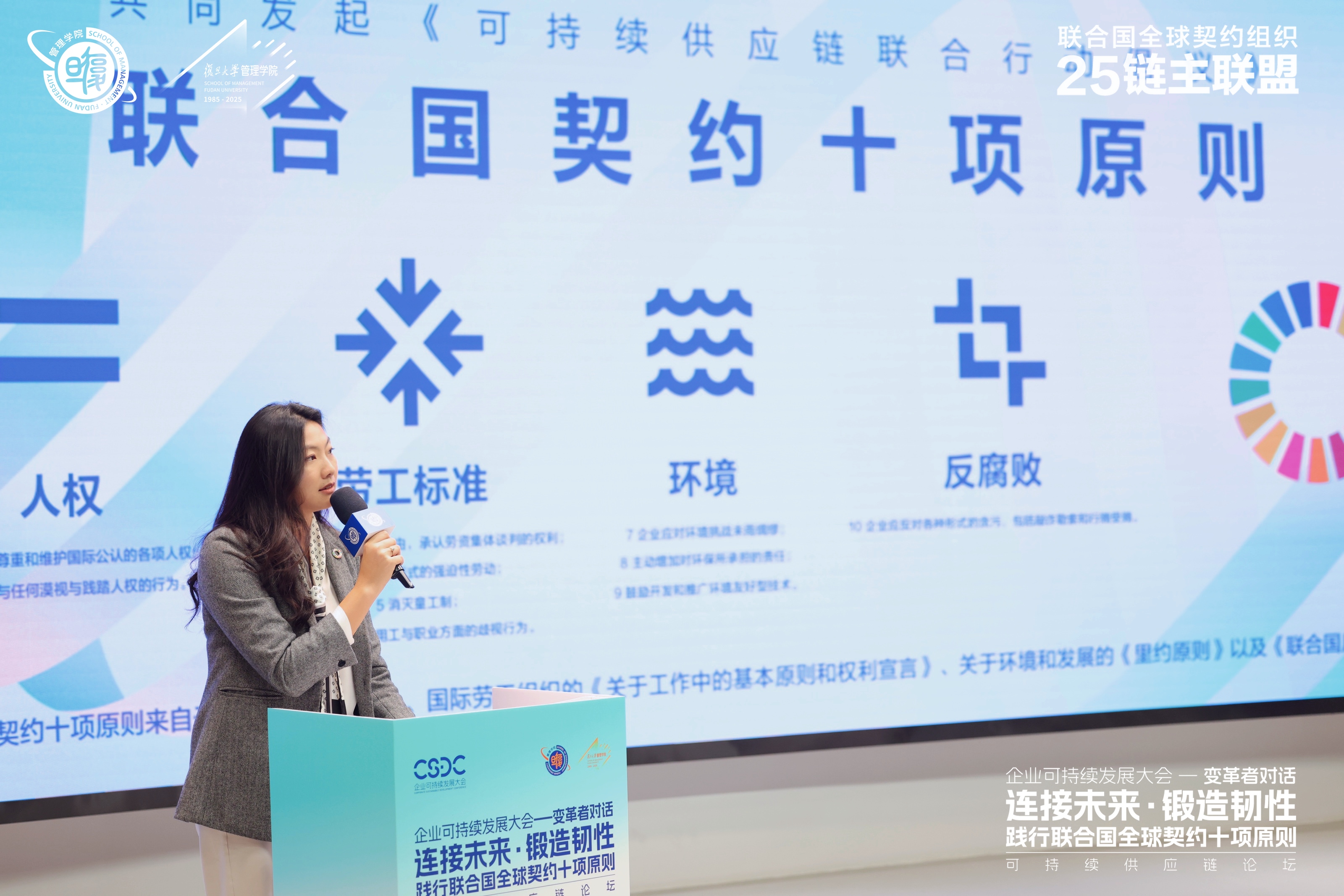 联合国全球契约组织在华联络办公室项目运营和全球契约学院高级经理葛倩宣读了十项原则的核心内容,涵盖人权、劳工标准、环境与反腐败四大领域,这些原则是企业践行ESG理念的重要基石,将为供应链管理提供明确的行动框架。