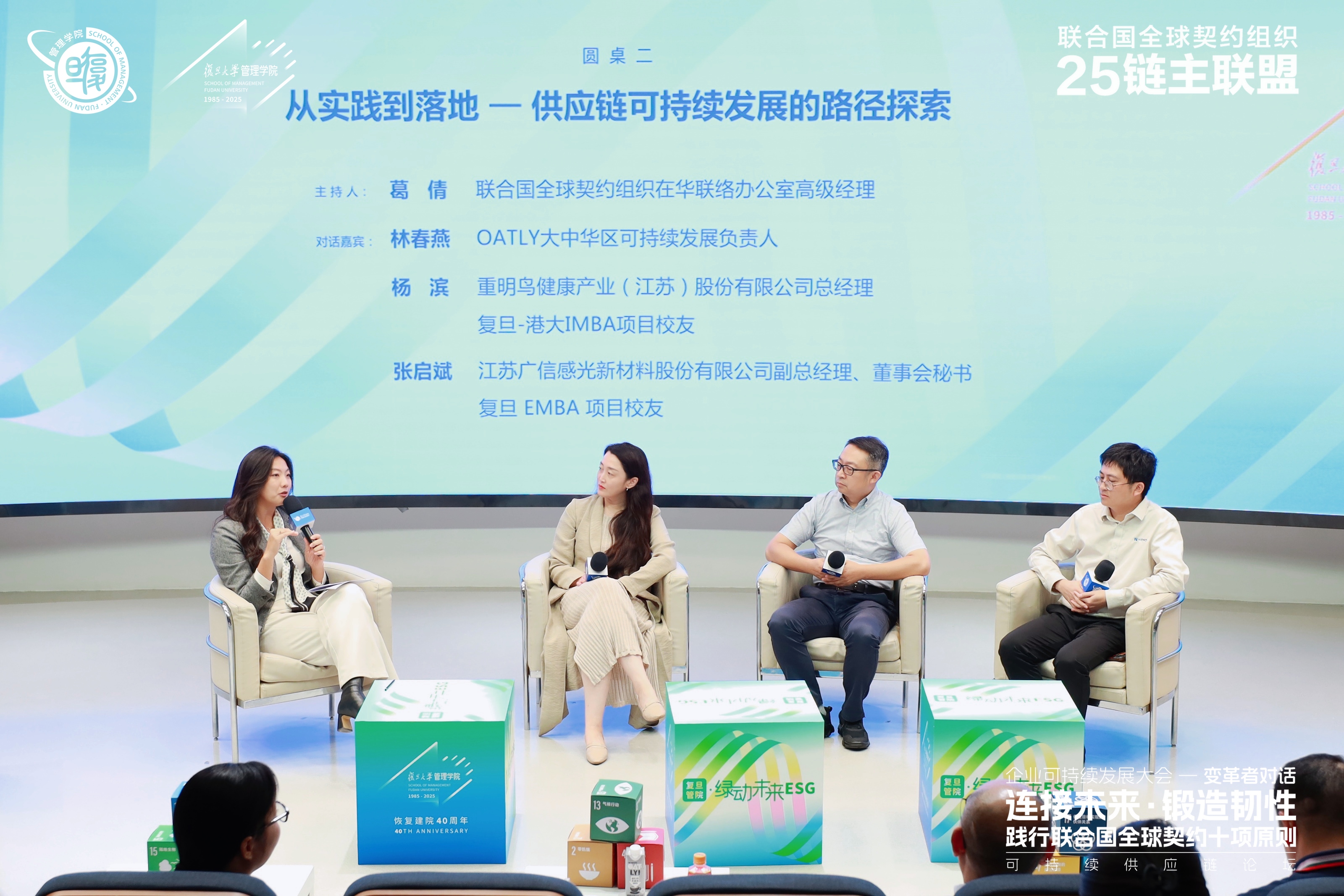 由葛倩主持,在“从实践到落地”圆桌环节,OATLY、重明鸟与广信材料三家企业从食品饮料、公共卫生与精细化工等不同行业出发,分享了将可持续理念转化为商业实践的系统路径。OATLY通过分类别、分步骤的供应链管理策略,在原料、包装、能源等环节建立企业标准与第三方审计机制,确保可持续承诺贯穿全链;重明鸟则以“技术+商业模式”双颠覆,将传统公共卫生设施从“污染源”转变为“绿电+商业”闭环的环保资产,实现从负债到增值的根本转变;广信材料则强调“可持续是必修课”,通过与供应商共同开发低碳、低VOC产品,推动下游客户实现绿色转型,抢占市场先机。三方均指出,可持续供应链不仅是风险管控的手段,更是驱动创新、构建竞争壁垒的核心战略,唯有将环境与社会价值融入商业逻辑,才能在未来的产业格局中持续领先。