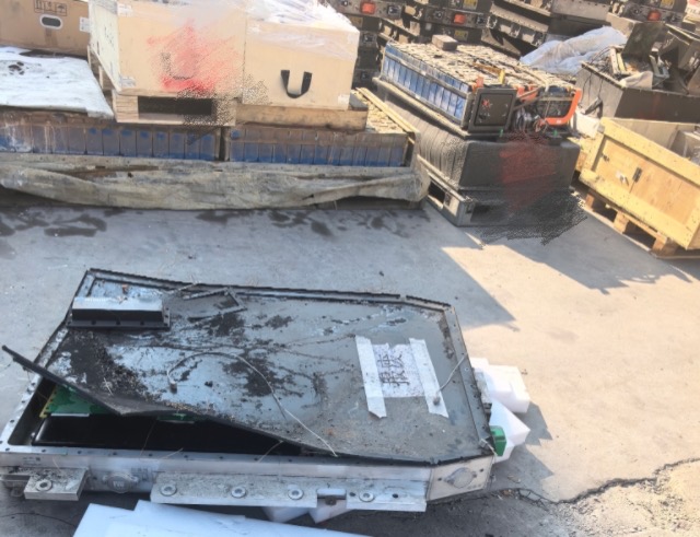 整个园区内有6栋厂房,第一排厂房看上去并没有人办公,而走到后排,整个厂房真实的功能才呈现在眼前,厂房外的水泥地上随意摆放着超过100件待拆解的旧动力电池包,有的电池包被撬开了一角,有的电池包旁放着一台小型切割机。