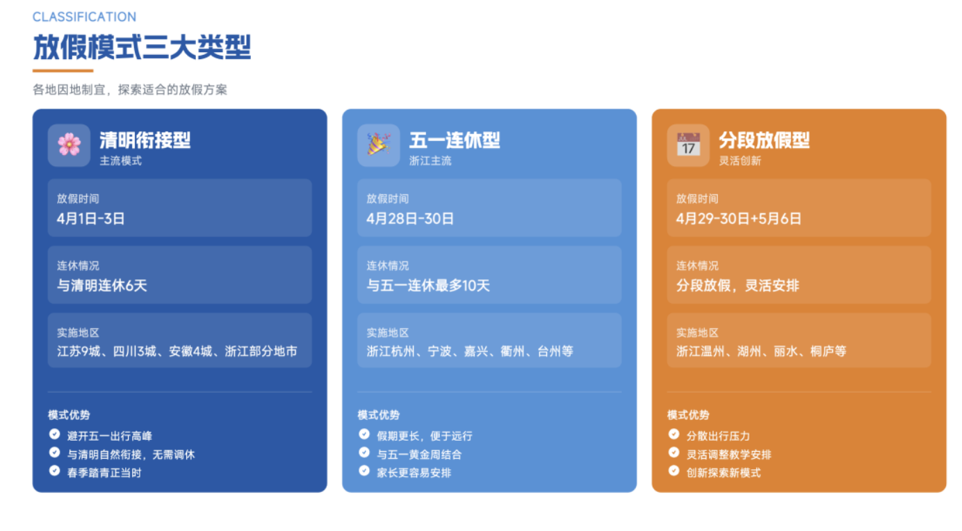 据统计,各地因地制宜形成了清明衔接型、五一连休型、分段放假型三大差异化放假模式。