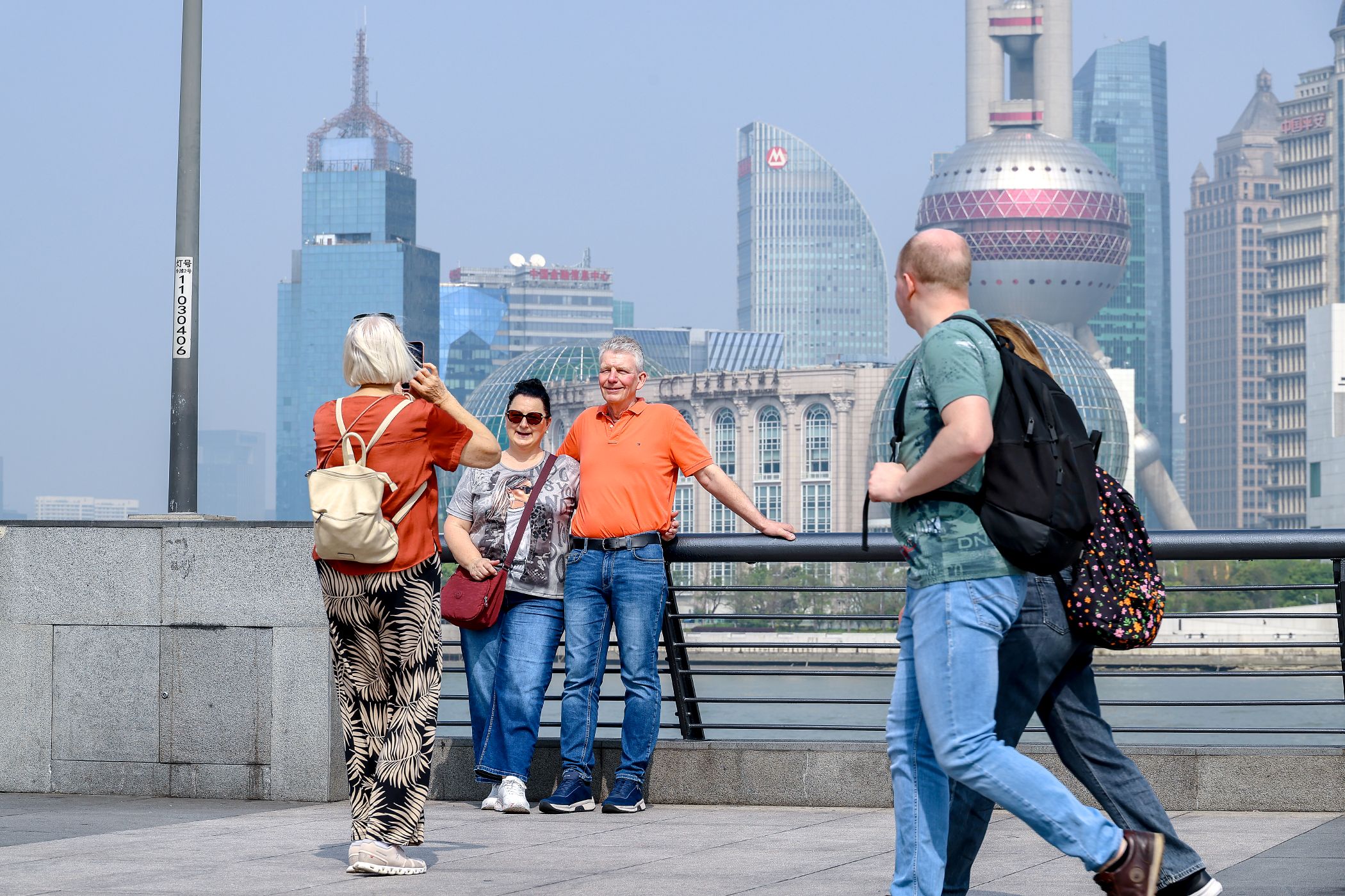 2026年4月10日,上海,外国游客在外滩观光平台拍摄黄浦江对岸的陆家嘴摩天大楼。(视觉中国图)