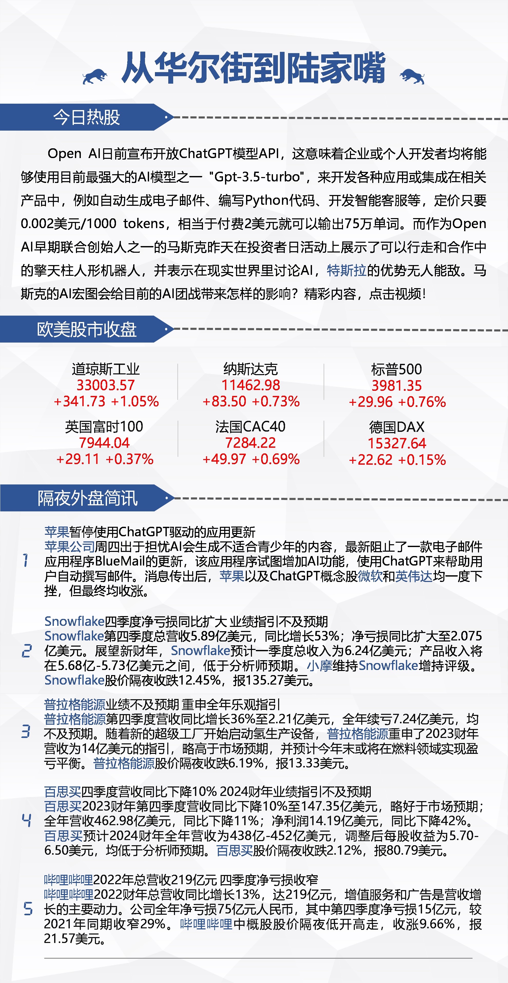 Open AI日前宣布开放ChatGPT模型 API,这意味着企业或个人开发者均将能够使用目前最强大的AI 模型之一 "Gpt-3.5-turbo",来开发各种应用或集成在相关产品中,例如自动生成电子邮件、编写Python代码、开发智能客服等,定价只要0.002美元/1000 tokens,相当于付费2美元就可以输出75万单词。而作为OpenAI早期联合创始人之一的马斯克昨天在投资者日活动上展示了可以行走和合作中的擎天柱人形机器人,并表示在现实世界里讨论AI,特斯拉的优势无人能敌。马斯克的AI宏图会给目前的AI团战带来怎样的影响?精彩内容,点击视频!