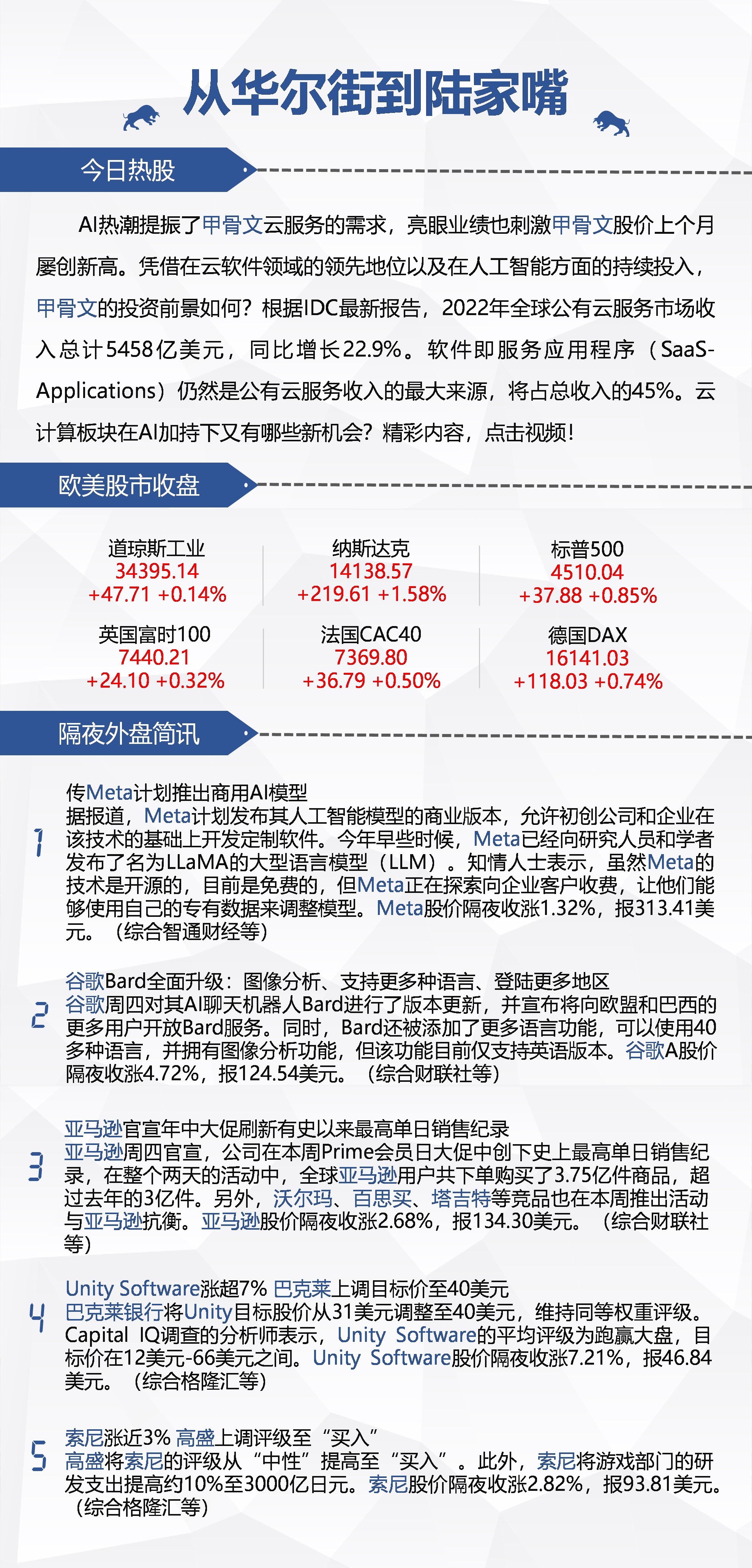 AI热潮提振了甲骨文云服务的需求,亮眼业绩也刺激甲骨文股价上个月屡创新高。凭借在云软件领域的领先地位以及在人工智能方面的持续投入,甲骨文的投资前景如何?根据IDC最新报告,2022年全球公有云服务市场收入总计5458亿美元,同比增长22.9%。软件即服务应用程序(SaaS-Applications)仍然是公有云服务收入的最大来源,将占总收入的45%。云计算板块在AI加持下又有哪些新机会?精彩内容,点击视频!