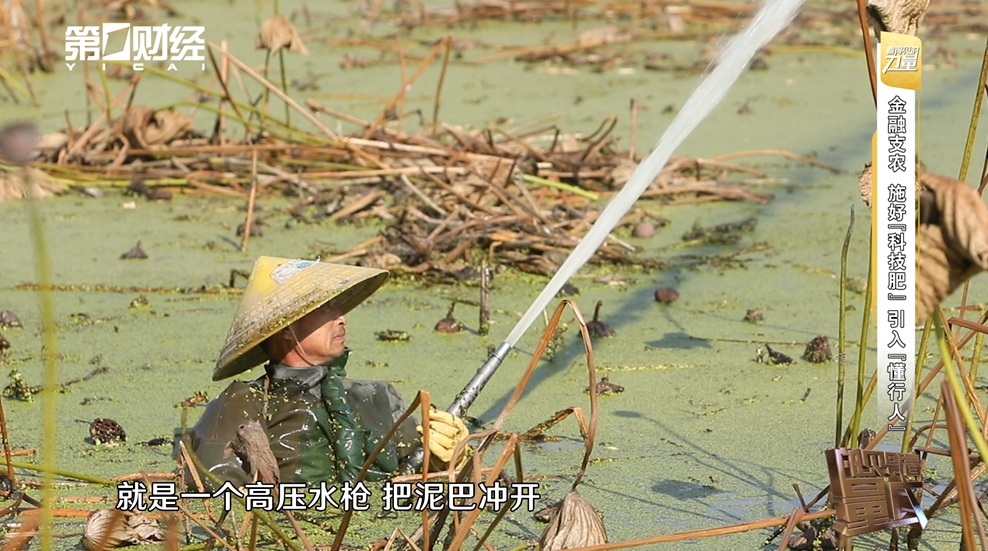 华贵莲藕基地挖藕工方家茂:就是一个高压水枪,把泥巴冲开。