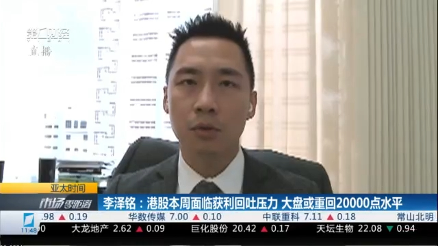 亚太主要股指走势分化,港股今日交托与前两周相比显著回落,周末内地也有新消息可能影响投资者情绪,港股后市如何观察?红蚁资本投资总监李泽铭表示,港股本周面临获利回吐压力,大盘或重回20000点水平。